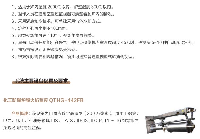 爐窯高溫監(jiān)測監(jiān)控系統(tǒng)是專為工業(yè)高溫爐窯監(jiān)測監(jiān)控的設計的智慧管理平臺,是針對爐壁開孔和爐窯視像有嚴格要求的高溫爐窯而研制的高溫工業(yè)電視。利用特種高溫孔式光學鏡頭,鏡頭設計采用中繼物鏡,兩次成像系統(tǒng),使像面在遠離觀察孔的CCD靶面上形成,最大限度的減少進入攝像機的熱輻射,致力為冶金、電力、建材、礦山、化工等行業(yè)服務。我公司研發(fā)主導產品已擁有第三代SG內窺式高溫工業(yè)電視系列、爐壁式高溫工業(yè)電視系列、內窺式拐角高溫工業(yè)電視系列、鍋爐汽包水位電視系統(tǒng)等成套設備,以及各種風冷防護罩,水冷防護罩,渦旋制冷防護罩等工業(yè)監(jiān)控設備配套產品。產品廣泛應用于鋼鐵廠加熱爐、退火爐,電廠鍋爐爐膛火焰、水泥廠回轉窯窯頭看火、篦冷機看料、玻璃廠玻璃熔窯等特殊高溫環(huán)境。幫助用戶進行工業(yè)爐實時電視監(jiān)測及控制,解決設備的運行故障等,對用戶改善產品質量、降低成本、安全生產有著獨特的成效。受到了用戶的一致好評。